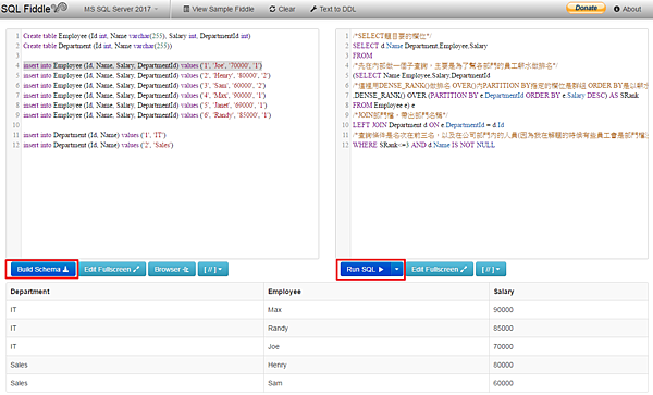 選擇資料庫為MS SQL Server 2017並套用下述大大的教學語法,則可以線上模擬SQL的執行結果。